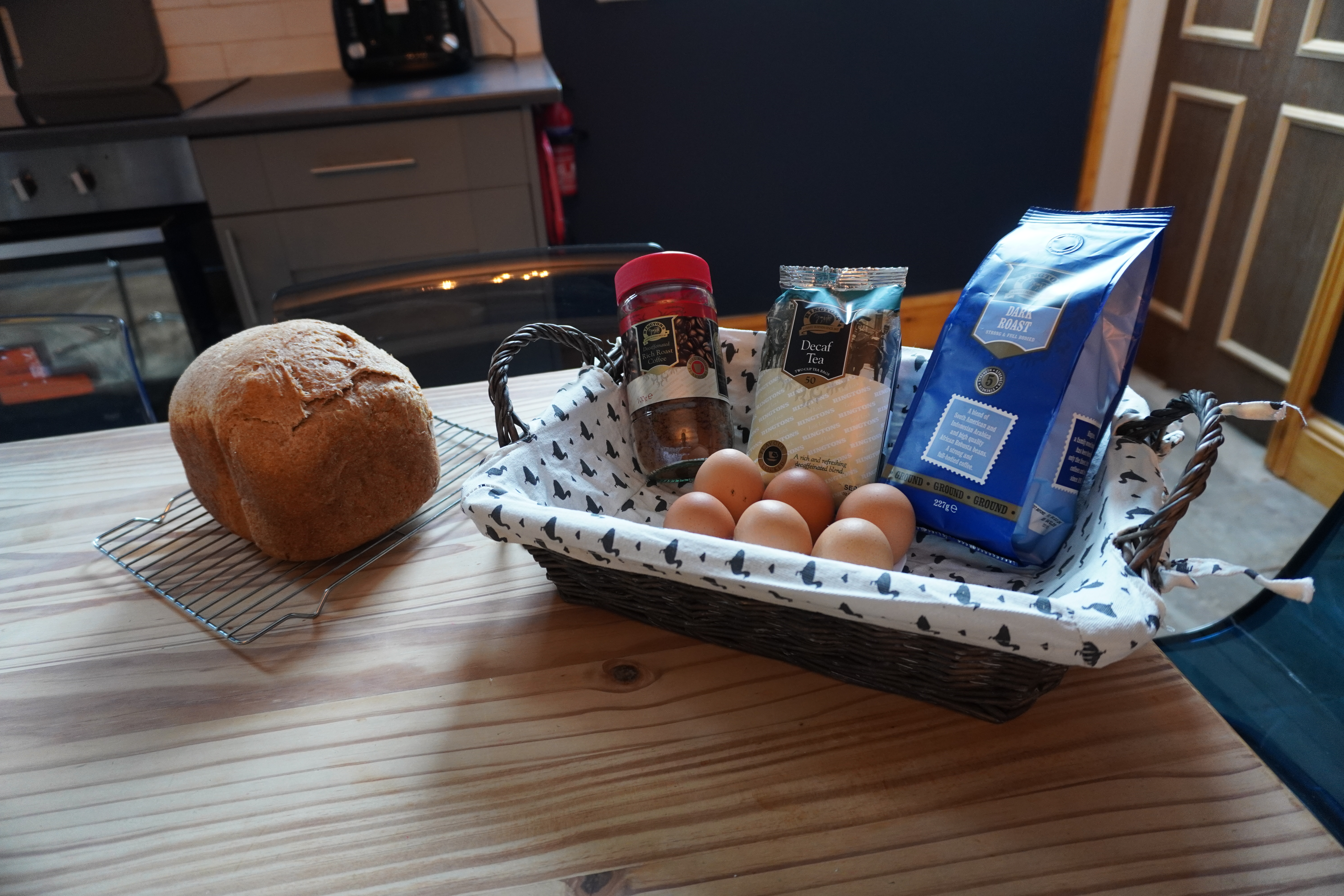 From the image shown above, everyone gets a welcome package. We love this detail as it’s like an extra warm welcome when you arrive at the AirBnb. Included is a freshly made loaf of bread, fresh eggs from the chickens on the farm, tea/coffee and fresh milk. Along with a bottle of Prosecco to start your cosy stay in the right way!